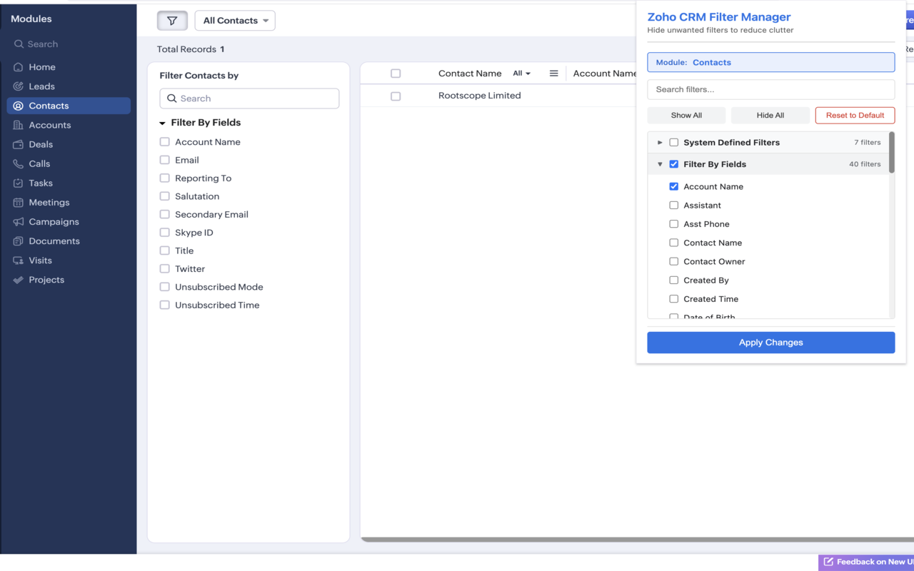 Once installed, the extension adds a small icon to your Chrome toolbar. Click it while on any Zoho CRM page, and you’ll see a list of all available filters. Simply uncheck the ones you want to hide, click “Apply Changes,” and they disappear from your Zoho CRM interface.